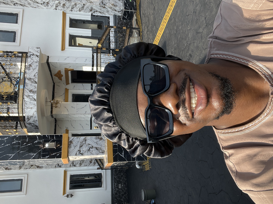 male subject taking a selfie outdoors in Alor, Nigeria. He is smiling with visible teeth, has a mustache, and a short beard. He wears black, square-framed sunglasses, a black satin sleep bonnet, and a light brown traditional-style shirt featuring white embroidered patterns. Behind him is a multi-story building characterized by white exterior walls, black and white marble-patterned cladding, and extensive gold-colored decorative accents. These accents include trim on columns and cornices, intricate metal balcony railings, and a prominent circular gold crest on an upper balcony. Dark-framed windows are set into the building. The ground is covered with dark, patterned paving. A green bucket is partially visible in the left background. The scene is illuminated by bright natural light.