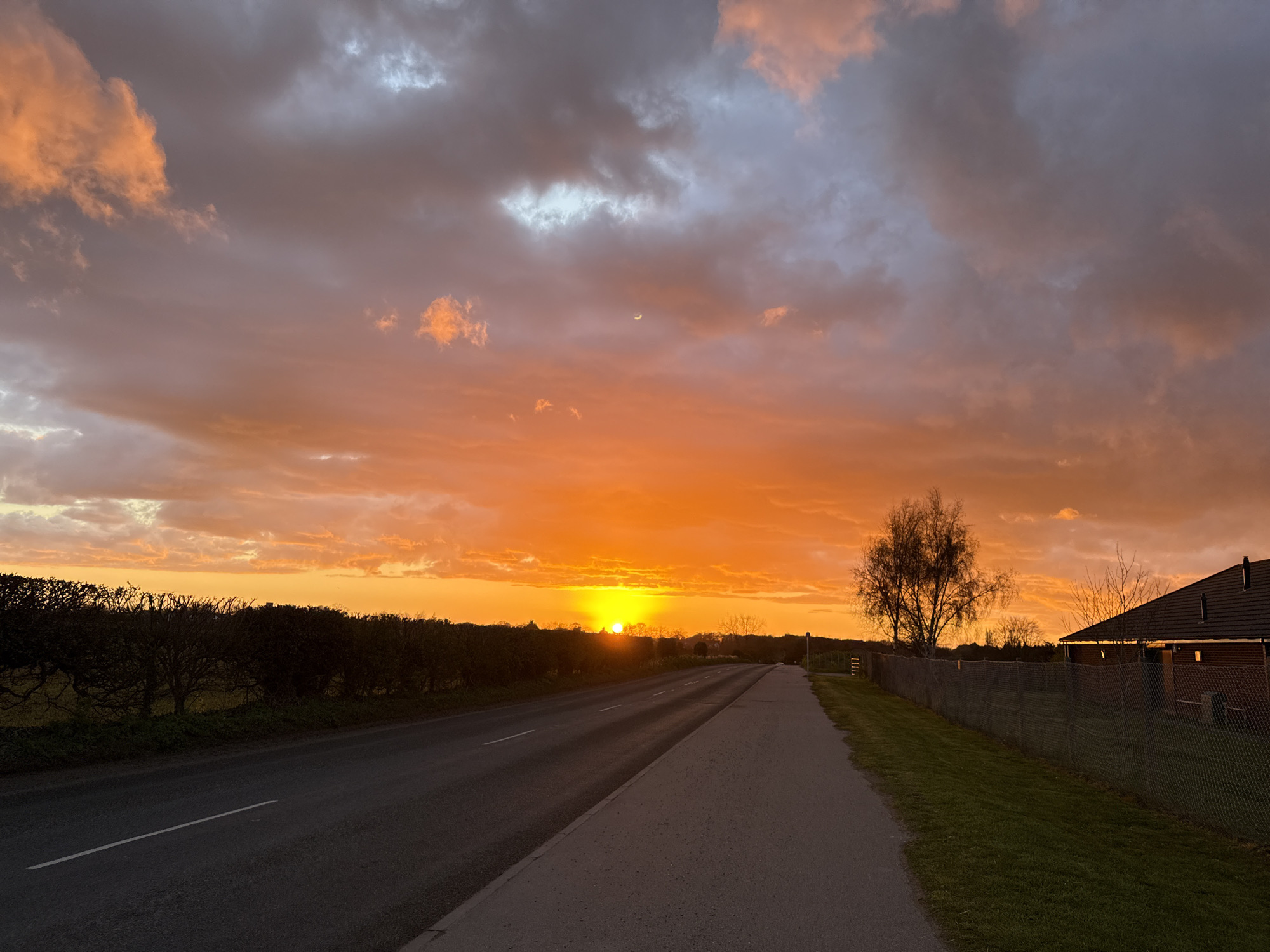 A landscape photograph shows a sunset in the sky over a road. The sky is filled with clouds, and the setting sun emits an orange glow. The road runs parallel to the image's lower edge and is flanked by a walkway on the right. A hedge lines the left side of the road, with trees further along. On the right, a chain-link fence runs along the walkway, adjacent to a grassy area and building. A tree is visible near the fence. A crescent moon is visible. The location is unknown but it is within Great Yarmouth, UK. No people are visible.