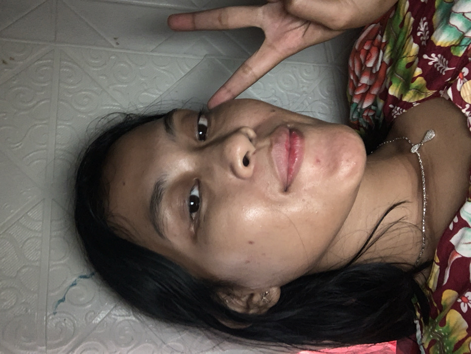 A young woman lies sideways on what appears to be a tile floor. She has dark hair, brown eyes, and fair skin. She wears a floral top and a delicate silver necklace with a pendant. She is making a peace sign with her right hand, positioned above her forehead. Her expression is serene.