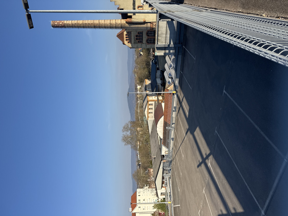 The image presents an elevated, wide-angle view of an urban landscape in Rastatt, Germany, under a clear, bright blue sky, indicating daylight with a low sun angle casting long shadows. In the foreground, an empty, asphalt parking lot occupies the lower half of the frame. White painted lines delineate parking spaces. Long, dark shadows from an unseen structure and a streetlamp stretch across the asphalt from left to right. A gray metal mesh safety fence with a rounded top edge runs diagonally along the right side of the parking lot, indicating the elevated vantage point. A concrete surface is visible immediately to the right of the fence. A modern streetlamp with two rectangular LED fixtures on a tall metallic pole stands prominently on the far right, partially cropped. Another similar streetlamp is visible further into the midground on the left. The midground features a dense collection of buildings. Dominating the right side is a tall, slender, cylindrical industrial chimney constructed of tan brick with darker brick bands near its apex, and an external metal ladder running vertically up its side. This chimney is part of a larger multi-story brick building with a red-tiled roof and arched windows, identified as the former Rastatt Brewery. To the left of this complex, a variety of lower-rise commercial or industrial buildings with flat gray or reddish-brown tiled roofs are visible, interspersed with bare deciduous trees. Further to the left, a modern, multi-story residential building with a white facade and red-tiled roof is present. In the distant midground, a white arched bridge crosses an unseen feature. The background consists of a continuous line of low, rolling hills or mountains stretching across the horizon. The sky above is uniformly clear and bright blue. No individuals, vehicles, or overt actions are discernible within the frame. The scene is static, devoid of active human or vehicular presence.