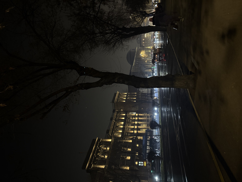 This is a nighttime street scene in Yerevan, Armenia, specifically depicting Government House 1 on Republic Square, viewed from the opposite sidewalk. The environment is dark, with wet asphalt reflecting artificial lights, indicating recent rain or ongoing precipitation. A faint atmospheric haze diffuses distant light sources. On the left, Government House 1 stands prominently, illuminated by warm yellow floodlights that highlight its classical architectural details, including ornate window frames and cornices. Further down the street, a large building with a distinctive dome is partially visible through the haze. The multi-lane street in the midground features moderate traffic. Numerous vehicle headlights are visible as bright streaks, and red taillights from vehicles moving away from the camera can be seen. A dark blue bus is discernible in the left lane. On the right, a sidewalk is lined with bare deciduous trees. A single individual, dressed in a dark coat and a red hat, is walking away from the camera on the sidewalk, carrying a bag in their left hand. The dark sky above is overcast.