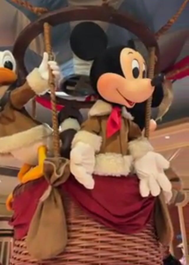 The camera pans up to reveal a hot air balloon prop featuring Mickey Mouse and Donald Duck inside the basket
