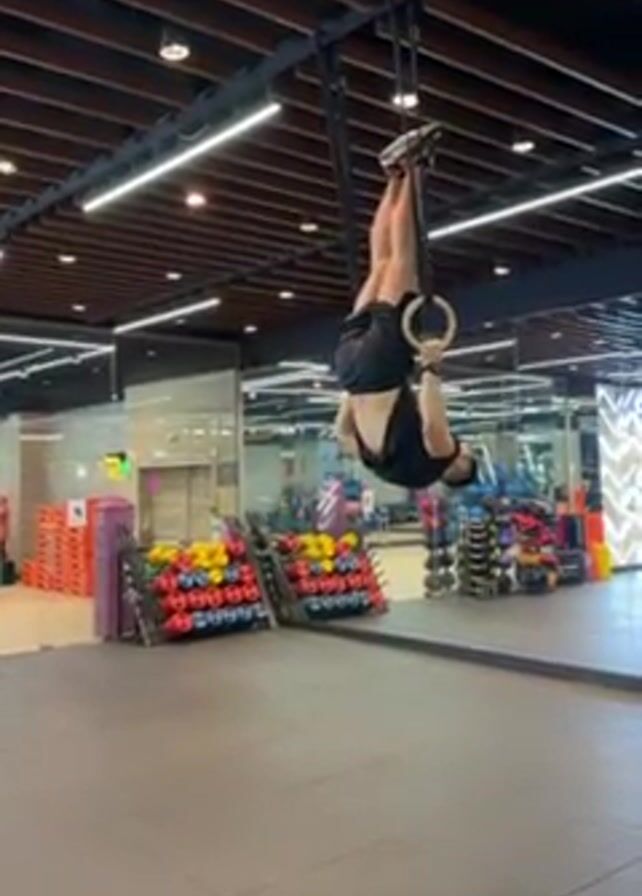 A man is working out in a gym. He is wearing a black shirt and black shorts with white and black shoes. He is hanging upside down from gymnastic rings, with his feet hooked on the straps above the rings. He is facing a mirror. Behind the mirror, there are rows of colorful kettlebells and other workout equipment. The man swings his legs out in front of him and then releases his feet from the straps, landing on his feet.