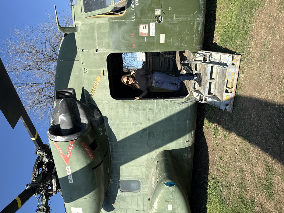 A woman in blue jeans, black shoes, and a black long-sleeved shirt poses in the doorway of a military helicopter. The helicopter is olive green and appears to be a decommissioned aircraft displayed on a patch of grass and dirt. The helicopter door is open, providing a view of the interior. Part of the rotor and a tree are also visible. The sky is a clear, bright blue.