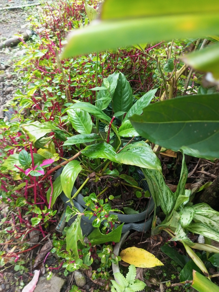 This image depicts a close-up, ground-level view of dense vegetation in Pandaria, India. The central focus consists of multiple broad-leaved green plants, some appearing to grow within a partially visible dark grey or black plastic container. To the immediate left of this central cluster, a dense mass of smaller plants with thin, upright red stems and predominantly green leaves, some with pinkish-red variegation, extends across the left side of the frame. To the right, another plant with variegated green and light green or white striped leaves is visible. The ground beneath the foliage consists of dark soil, small stones, and organic debris, including a single distinct yellow leaf. Several leaves, particularly on the central green plants, exhibit a moist or wet appearance. Blurred green foliage occupies the extreme foreground and parts of the background, partially obscuring the wider environment. No individuals or active subjects are present in the scene.