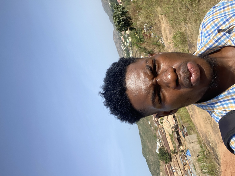 A male individual, appearing to be in his 20s, with dark skin, dark curly hair, and a trimmed beard, is depicted in a close-up selfie in Gwong, Nigeria