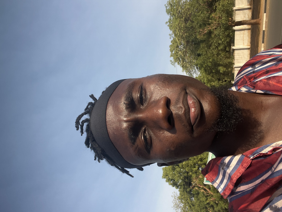 The image presents a close-up, outdoor portrait of a dark-skinned male individual, likely in his late teens or early twenties, set against an urban or suburban backdrop in Birnin Kebbi, Nigeria. The subject occupies the majority of the frame, facing directly forward. He has short, dark dreadlocks or twists contained by a black fabric headband across his forehead. His facial features include dark eyes, a broad nose, and full lips, with a short, sparse goatee on his chin. The subject exhibits a neutral to slightly contemplative expression, with a subtle upward curve at the corners of his lips and slightly furrowed eyebrows. His skin shows a natural texture with visible pores and minor blemishes on the forehead and cheeks. He is wearing a collared shirt with vertical stripes in red, white, and blue hues. The top button of the shirt is undone. The background reveals a clear, light blue sky, indicating daylight conditions with no visible clouds. Green trees with dense foliage are prominent on both the left and right sides of the frame, suggesting a well-vegetated environment. A dark asphalt surface, likely a road or paved path, is visible at the lower right, bordered by a light-colored curb. Behind this, a low, light-colored wall, consistent with a perimeter fence, extends horizontally. A small, partially visible green sign with white text, where "ATION" can be deciphered, is located on the far left, partially obscured by the subject's shoulder. The lighting is bright and natural, suggesting outdoor conditions during the day, with sunlight appearing to originate from the viewer's right, casting subtle shadows on the subject's left side. The environment is consistent with an urban or peri-urban area within Birnin Kebbi, Nigeria, given the tropical vegetation and visible infrastructure. However, specific landmarks for precise street or building identification within the city are not discernible from the provided visual details.