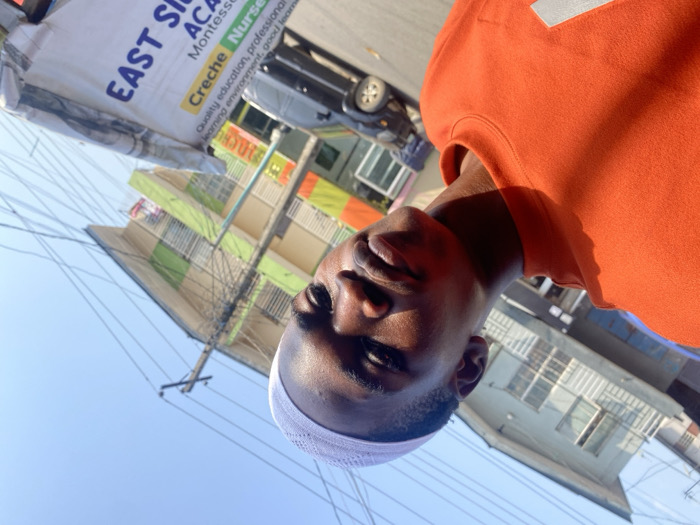 A young dark-skinned male, wearing an orange long-sleeved shirt and a white kufi cap, poses for a close-up photograph outdoors in Lagos, Nigeria
