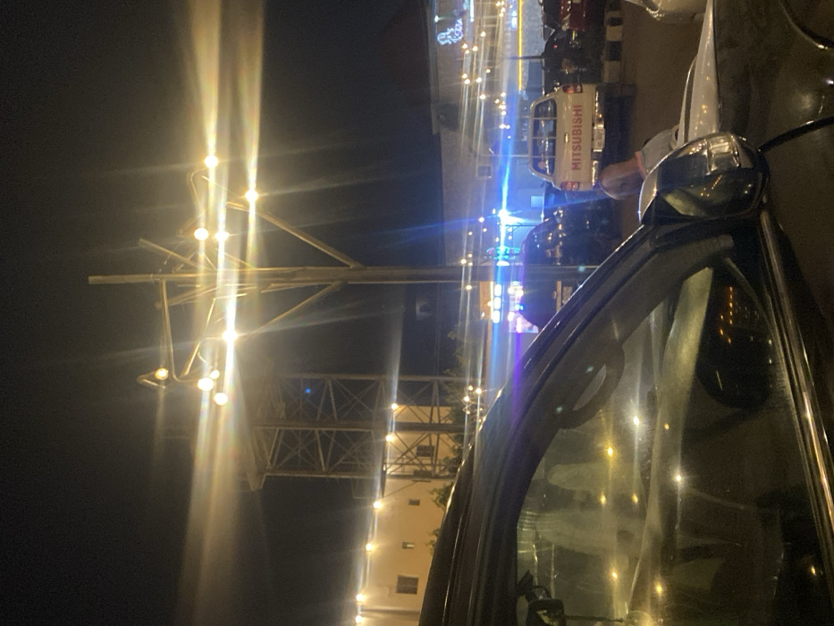 Night scene with a car parked in the foreground, its window reflecting streetlights. A tall structure, possibly a building or tower, is illuminated with strings of lights, creating a festive atmosphere. Vehicles, including a Mitsubishi truck, are visible in the background, parked along the street. The overall image captures the ambiance of a night out.