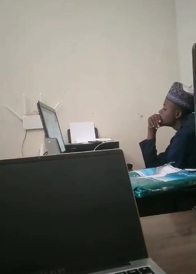 Here's a detailed description of the video: The video shows an office setting with a young man sitting at a desk and a laptop in the foreground. The man is wearing a traditional patterned hat and a dark blue top. He has his hand to his chin and appears to be in deep thought or contemplation, looking slightly to the side. On the desk, beside him, is a pack of paper. Behind him is another laptop screen and a printer, along with what seems to be a wireless router mounted on the wall. The walls are painted in a plain, light color. The camera moves slightly, focusing at times on the man's face, then pulling back to show the desk and surroundings. The overall atmosphere is quiet and focused.