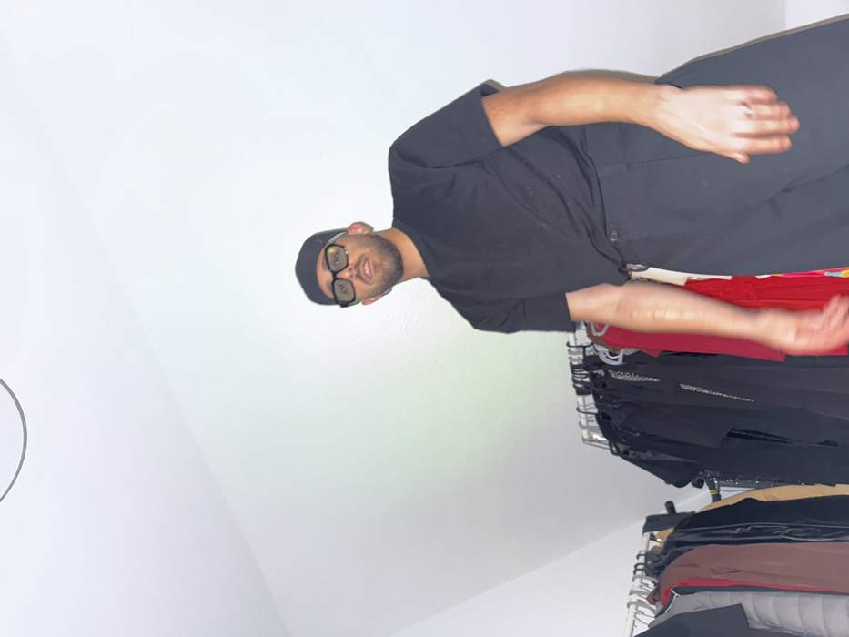 A man with dark hair and a short beard, wearing a black skullcap and glasses, is positioned on the right side of the frame. He's wearing a dark button-down shirt. His arm is extended, hand gesturing. Behind him is a clothing rack filled with garments of varying colors, including red, black, and brown. The background is a plain white wall, with a circular object visible on the far left.