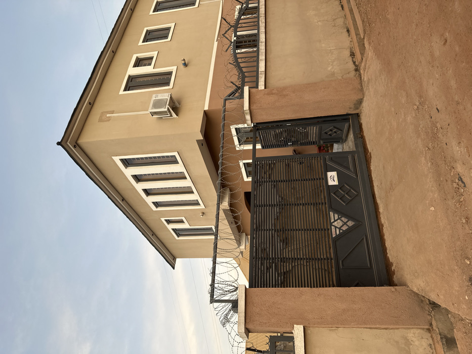 A two-story, beige building with white-trimmed windows is shown. An air conditioning unit is mounted on the exterior. A black metal gate with geometric designs is secured by a brown concrete wall topped with barbed wire. The ground is red dirt. The sky is a clear, pale blue.