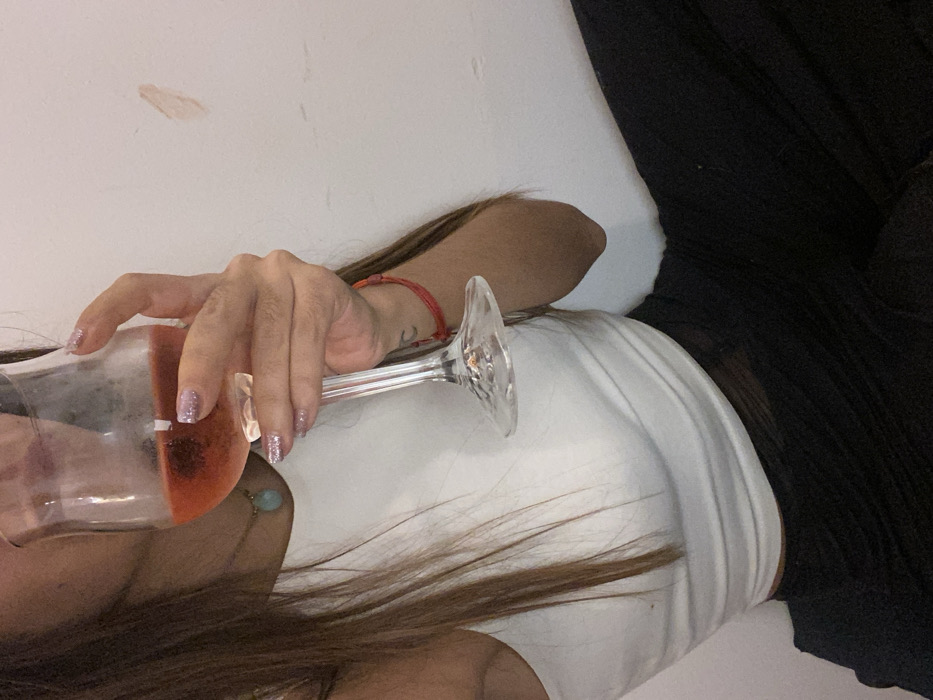 A female individual is depicted from the chest up, positioned against a plain white wall in an indoor setting. She is holding a clear stemmed wine glass containing a rosé-colored liquid with her right hand, bringing it to her lips as if drinking. Her lower lip is partially visible. She has long, dark hair flowing over her left shoulder and chest. She is wearing a white sleeveless top and black, possibly textured, trousers or leggings. A delicate gold-colored chain necklace with a light blue pendant is visible on her neck. Her right wrist displays a red string bracelet and a small, dark crescent moon tattoo. Her fingernails are covered in a glittery light pink or silver polish. A faint, light brown smudge is present on the white wall to the right of her head. The image provides no identifiable visual information to determine a specific location within Barcelona, Spain, or any other geographical area.