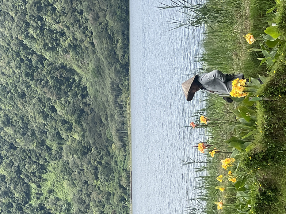 This image captures an outdoor scene in Bedugul, Indonesia, featuring a single individual amidst lush vegetation by a large body of water, with a forested mountain in the background