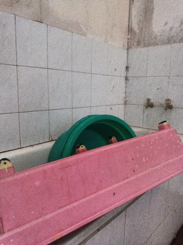 A tiled bathroom corner features a green wash basin and a pink plastic object, possibly a step stool, placed within a bathtub