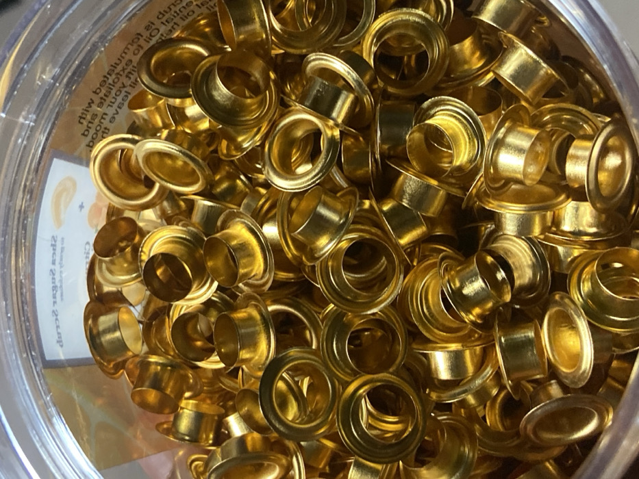 In Oba-Aboji, Nigeria, a transparent, clear plastic container is filled with a high density of small, brass-colored metal eyelets. Each eyelet is circular, featuring a flared top flange, a cylindrical barrel, and a central opening. The metallic surfaces reflect ambient light, exhibiting varying degrees of brightness and shadow, highlighting their convex and concave forms. The eyelets are haphazardly oriented within the container. Blurred, inverted text from a product label is visible through the plastic on the container's opposite side, primarily in the upper background. No individuals, actions, or direct interactions are depicted in the scene.