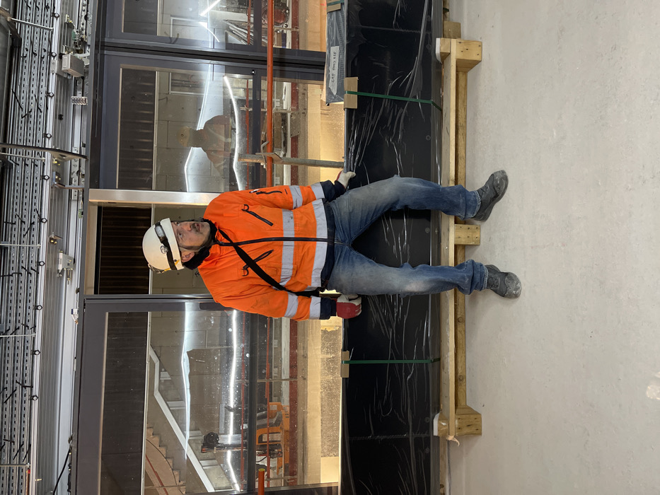 A male construction worker is depicted seated in an indoor, unfinished environment in Antony, France
