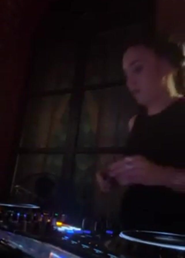 A DJ is shown waist up in a nightclub. The DJ is female with short black hair pulled back into a ponytail. She is wearing a black sleeveless top and has headphones around her neck. Her left wrist has a bracelet or watch on it, and she has a ring on the ring finger of her left hand. She is operating a DJ mixing board that has multiple knobs and sliders. The lights on the board are blue, yellow, and orange. The DJ is moving her hands over the board and appears to be singing along to the music. The background is dark, and it is possible to see a brick wall and a window frame behind her.
