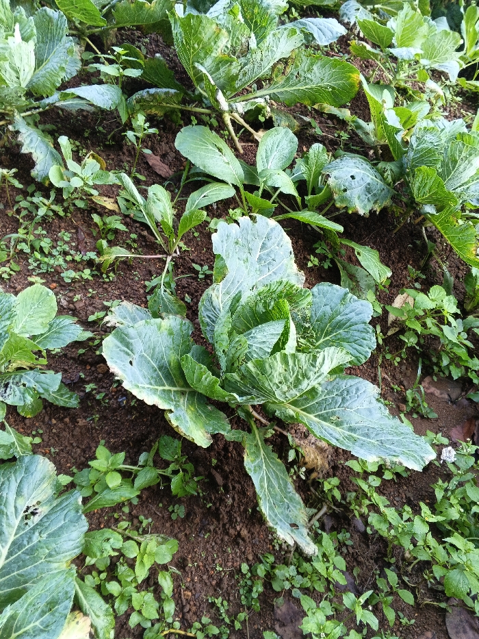 A garden bed exhibits thriving cabbage plants with robust, green leaves. The soil is dark and moist, with interspersed patches of smaller green weeds. Damage is visible on some leaves. The plants are closely spaced. The composition suggests a productive, albeit somewhat overgrown, vegetable garden.