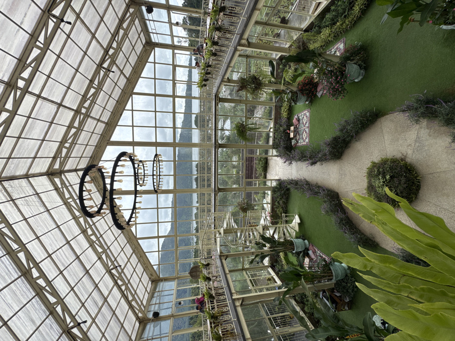 A greenhouse interior showcases a view of a lake through large glass panes. The structure features a glass ceiling with geometric supports and three circular chandeliers. Inside, a winding stone pathway is lined with greenery and potted plants. The ground is partially covered with green turf and decorative rugs. The space incorporates both natural elements and structural design.