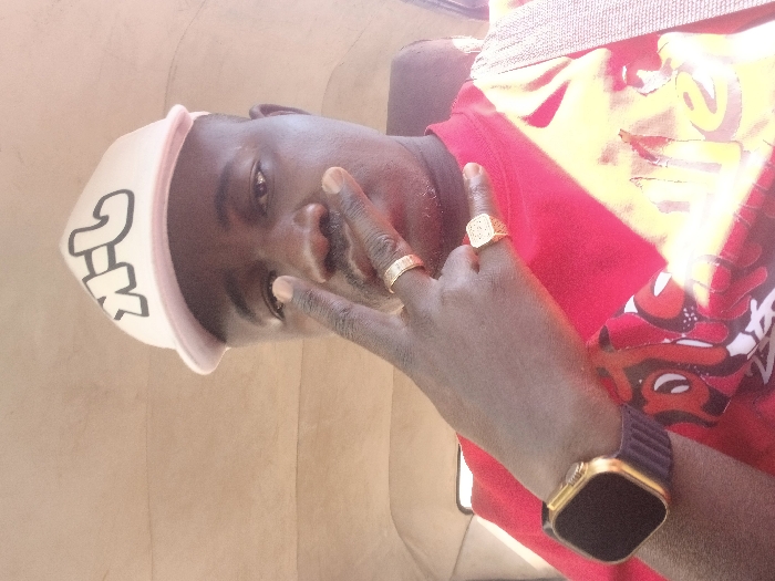 An adult male is captured in a close-up selfie, seated inside what appears to be a vehicle. He has dark skin, a mustache, and is looking directly at the camera. He wears a red t-shirt with an indeterminate graphic design, and a light-colored baseball cap featuring dark, stylized "K-L" characters on the front. His left wrist displays a gold-colored smartwatch with a dark strap and a dark, unlit screen. His right hand is raised towards his face, forming a V-sign with the index and middle fingers extended. Two gold-colored rings are present on his right hand: one on the ring finger and a square-faced signet ring on the little finger. The background reveals a light brown or beige vehicle ceiling lining with horizontal seams, a dark brown headrest behind the subject's right shoulder, and a light-colored seatbelt diagonally crossing his right side. A prominent diagonal beam of sunlight illuminates portions of his chest and right arm. The image lacks specific visual identifiers to confirm the stated location as Jos, Nigeria.