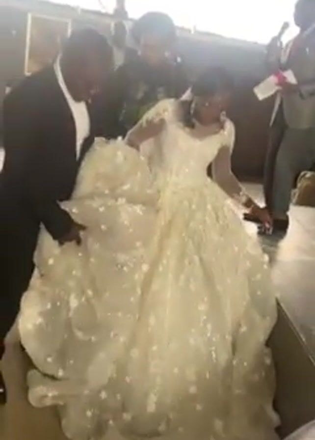 A bride in a white, long-sleeved wedding dress is helped onto a raised platform by a man in a suit. She sits down and moves her arms while several other people stand around her. A man in a grey suit stands off to the side. The video is shaky. The area is covered and a fan is visible in the rafters.