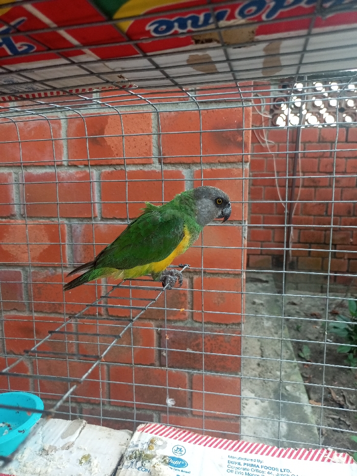 - "A Senegal Parrot (Poicephalus senegalus) is depicted perched on the wire mesh of a metal cage" by FM-Xxi3D2, licensed under CC BY 4.0