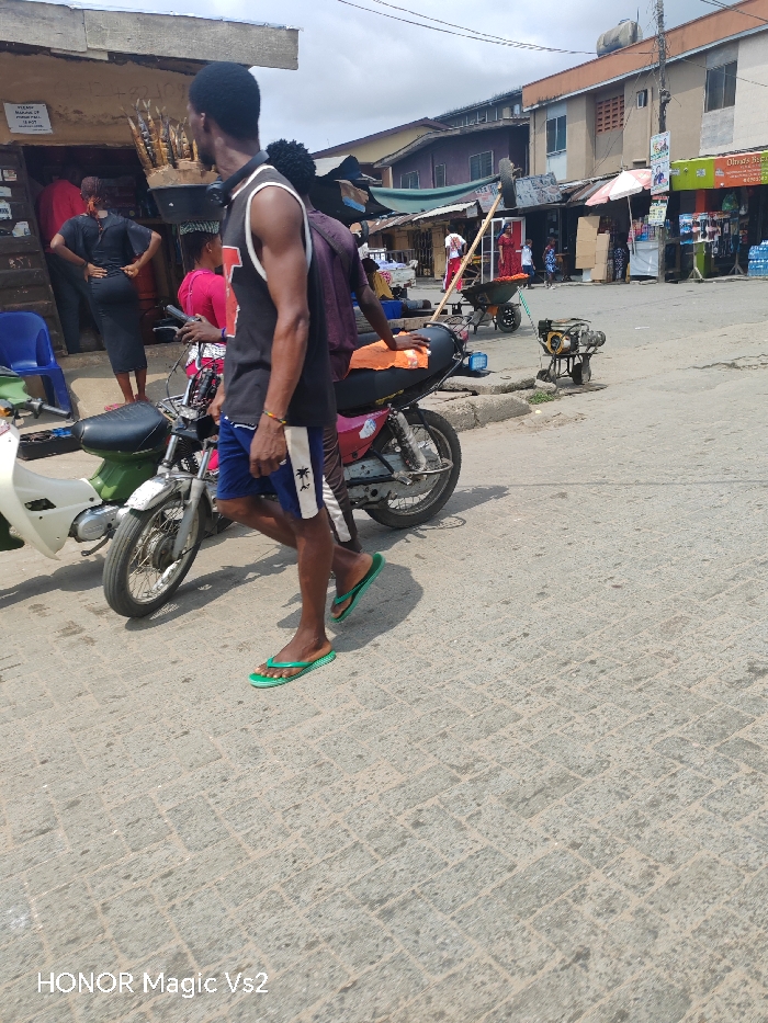 A sunny street scene shows people and motorbikes. A man in a tank top and shorts walks in the foreground, wearing flip-flops. Behind him are two motorbikes. In the background, there's a collection of shops and buildings, plus people walking and working. A generator sits on the side of the road. The street itself is paved with interlocking stones. The sky is partially cloudy.