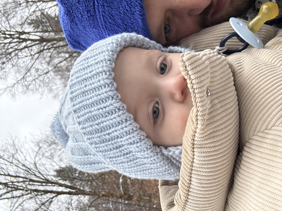 A close-up captures a serene moment between a parent and child outdoors. The baby, with striking blue eyes, is swathed in a light blue knit hat and beige corduroy jacket. A blue pacifier is attached to the jacket. The parent, partially visible, wears a blue fleece hat and holds the baby close. Bare tree branches frame the background, suggesting a winter scene.
