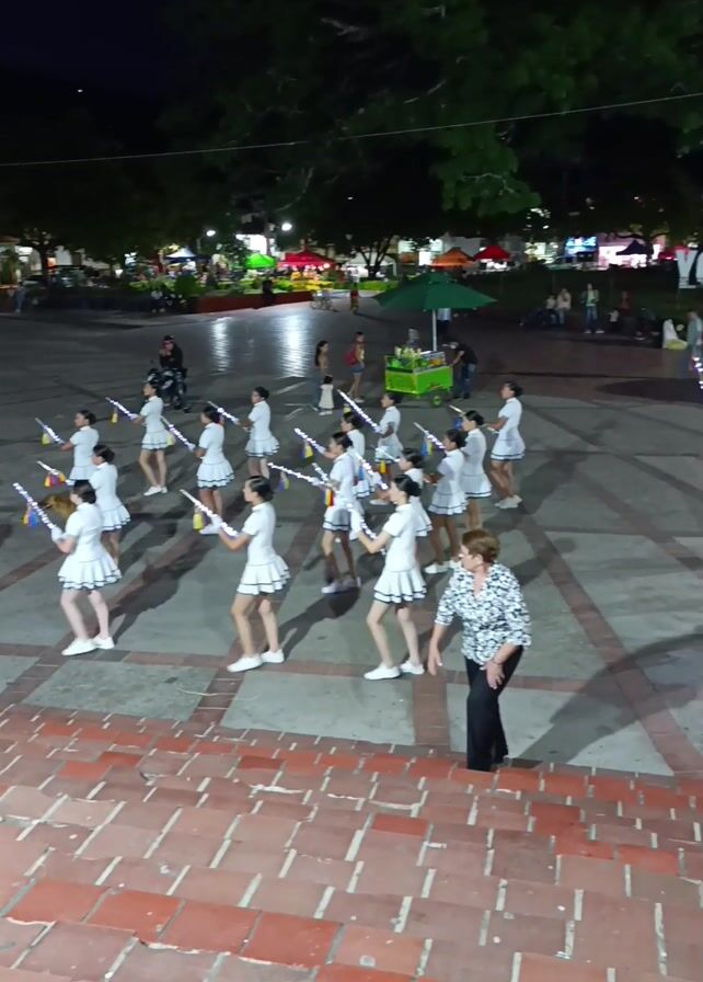 At night in an outdoor public space, a marching band is performing a show. The band is comprised mostly of young women, each dressed in a white skirt and top, and a sailor hat. They are carrying illuminated batons that are emitting a rainbow of light. At the head of the band is a man in a similar uniform. A woman in a patterned shirt and black pants is walking along with the band, presumably their instructor. The group is on a light-colored stone square that is decorated with a diamond pattern. A set of brick stairs leads up to the square. The square is surrounded by trees and other people. There are food vendors under umbrellas, and benches with people sitting on them. In the background is a large sign that reads “YO TIJANA”.
