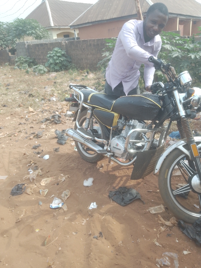 This image depicts an outdoor scene in Unknown, Unknown. A male subject is positioned to the left of a black and chrome "DAYLONG" motorcycle, holding the handlebars with his right hand. He is wearing a light purple collared shirt and dark trousers, and is smiling while looking towards the viewer. The motorcycle features a black textured seat with yellow accents, a black fuel tank with yellow trim, a chrome exhaust, and a chrome engine guard. The ground is unpaved, composed of reddish-brown dirt and sand, and is significantly littered with various debris, including numerous black and white plastic bags and other refuse. In the background, a low concrete wall is visible, behind which sparse green vegetation grows. Beyond the vegetation, two single-story buildings with brown corrugated metal roofs are partially observable. The lighting suggests daylight conditions.