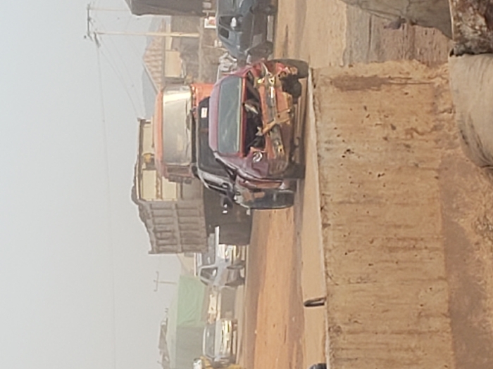 This image depicts a street scene in the city of Adonkolo, Nigeria, under dusty or hazy atmospheric conditions. In the immediate foreground, a weathered concrete barrier with visible staining spans horizontally. Centrally in the midground, a red/maroon sedan exhibits extensive rear-end damage; its trunk lid is absent, exposing internal structural components, and the rear bumper is missing. The vehicle's rear left side is visibly lower, indicating a compromised or missing tire. Directly behind the sedan, a large orange-cabbed dump truck with a loaded, open bed is positioned. To the left, a silver sedan and a white SUV are observed, facing left. A dark-colored vehicle is partially visible on the far right. The background consists of utility poles, power lines, and scattered buildings, some with dark roofs, along with green tarpaulin-covered structures on the far left. No discernible individuals are present, and the vehicles appear stationary or in slow transit.