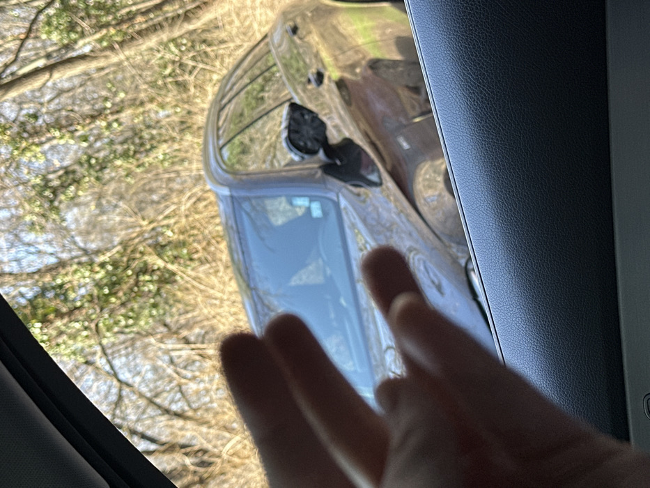 The image depicts a scene observed from inside a vehicle, looking out through the passenger side window. In the immediate foreground, a textured dark grey vehicle door panel is visible. A light-skinned human hand with three fingers (index, middle, and ring fingers) extended upwards is positioned in the mid-left of the frame, partially obscuring the view. In the midground, a dark-colored (likely black or dark grey) SUV or crossover vehicle is partially visible, appearing to be parked or stopped on an unpaved surface. The vehicle exhibits damage; its driver's side exterior mirror is dislodged, with its casing broken and internal components, including wiring, exposed. The reflective glass of the mirror is absent. Sunlight reflects off the vehicle's body and windows. The background consists of a dense area of deciduous trees with bare branches, suggesting a late autumn, winter, or early spring season. Some interspersed evergreen foliage or ivy is also present on the trees. The ground beneath the trees appears to be dry earth or sparse vegetation. The scene is brightly illuminated by natural light. The environment suggests a wooded or park-like area within or on the outskirts of Sofia, Bulgaria. Specific landmarks are not discernible from the image to pinpoint an exact location within the city.