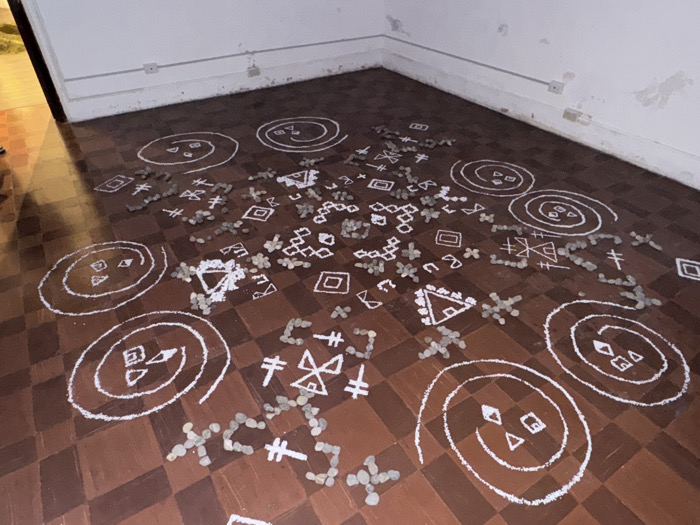 A room with a checkered brown floor displaying artwork. White chalk drawings depict spirals with geometric shapes inside, along with isolated triangles, squares, and cruciform figures. Small pebbles are arranged in clusters and lines around and sometimes within these chalk symbols. The walls are white with electrical outlets, adding a modern element to this floor-based art installation.