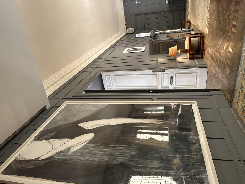 This image depicts an interior space, likely a hall or room, within a building located in Madrid, Spain. The walls are covered with dark grey, floor-to-ceiling wooden paneling, which features decorative trim. A light-colored crown molding separates the paneling from a light beige ceiling. The floor displays an intricate, multi-toned geometric parquet pattern, and a corner of a patterned rug with green, yellow, and red hues is visible in the immediate foreground. Dominating the left wall is a large, vertically oriented framed artwork, primarily in black, white, and grey tones, characterized by abstract forms and distinct vertical striations. The artwork's reflective surface clearly shows the reflection of large, multi-paned windows, indicating a source of significant natural light. To the right of the artwork, an open white paneled door with a horizontal bronze-toned handle provides a view into an adjacent interior area. Further down the paneled wall on the right, a dark grey paneled fireplace mantel is visible, with a small framed picture hung above it. A table lamp, featuring a cylindrical wooden base and a textured shade, rests on a dark wooden side table positioned next to the fireplace. In the background, another dark grey paneled door and a small, dark wooden stool are discernible. No individuals are present within the depicted scene.