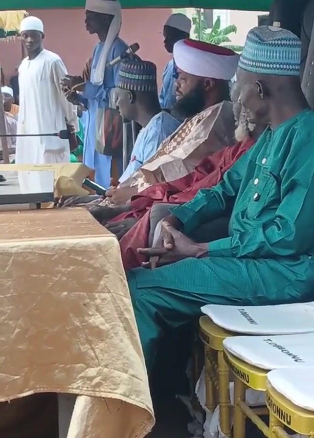 group of men seated under a green tent, seemingly attending an event. They are dressed in traditional attire, including robes and hats, and are seated at a table covered with a gold cloth. Some are holding phones or have them in their laps. Chairs with "OKOBRONNU" printed on them are provided for seating. The atmosphere seems formal, suggesting a meeting or ceremony of some sort.