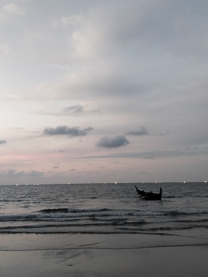 The image depicts a coastal scene at twilight or dawn in Curehtunong, Indonesia. The sky is overcast with pale grey and light pink clouds, suggesting ambient light conditions associated with sunrise or sunset. The horizon line separates the sky from a body of water, likely an ocean or large bay. The water surface is dark grey, exhibiting small, gently rolling waves that break into white foam near the foreground shoreline. Several small, distant white lights are visible horizontally across the water on the far horizon, possibly emanating from other vessels or coastal structures. In the mid-ground, a single dark-hulled boat, consistent with a traditional fishing or small transport vessel, is visible floating on the water. No individuals, explicit actions, or direct interactions are visible within the frame. The immediate foreground consists of wet, dark sand, showing subtle reflections and linear patterns from the receding tide.