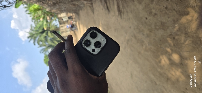 A dark-skinned hand, viewed from a first-person perspective, dominates the lower left of the frame. The hand holds a lit, hand-rolled cigarette (joint) between the index and middle fingers, with a faint glow visible at its tip. Below the cigarette, the hand also grips a black smartphone, possibly an iPhone, showcasing its rear camera module with three prominent lenses and a flash. The background features an unpaved dirt path receding into the distance. On either side of the path, dense green foliage and palm trees are visible. In the far distance along the path, two blurred human figures and what appears to be a bicycle or motorcycle are discernible. A rustic fence or wall constructed from natural materials runs along the right edge of the background. The sky above is light blue with scattered white cumulus clouds. A text overlay in the lower left corner reads "Galaxy S24" and "January 24, 2024 7:12 AM". The scene is located in the city of Unknown, Unknown.