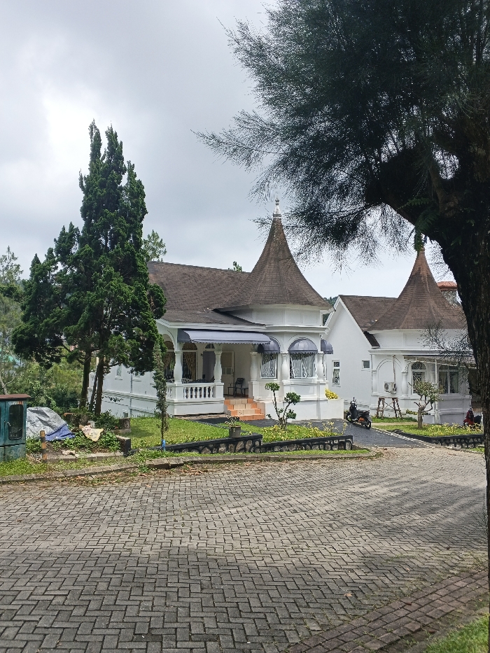 - "The image depicts a two-story, white-painted building with a multi-part structure, featuring two prominent conical, multi-tiered brown shingled roofs, each topped with a decorative finial" by FM-aUJUs1, licensed under CC BY 4.0