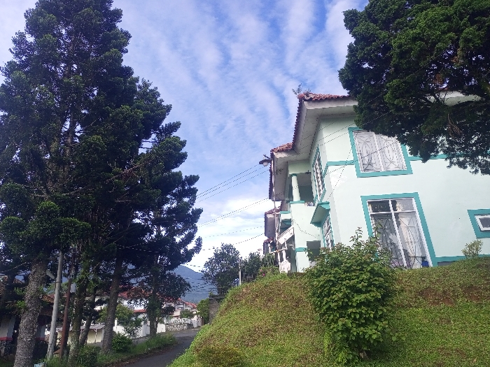 This image captures a residential and natural landscape in Pacet, Indonesia, under a partially cloudy blue sky. The scene is dominated on the left by several tall, dark green coniferous trees, exhibiting dense foliage and visible lower trunks. To the right, a multi-story building, painted light mint green with dark teal trim around its numerous white-framed windows, is situated on an elevated, grassy slope. This building features a reddish-brown tiled roof and multiple recessed balconies or architectural elements on its left facade. Utility lines traverse the mid-ground, extending towards the building from poles partially obscured by the trees. In the lower left quadrant, a dark paved road or pathway curves gently, bordered by smaller white residential structures. The foreground on the right consists of a steep, green grass-covered incline, featuring a prominent, dense green shrub. Distant green mountains or hills are visible in the background beneath the sky. No individuals or specific actions are depicted.