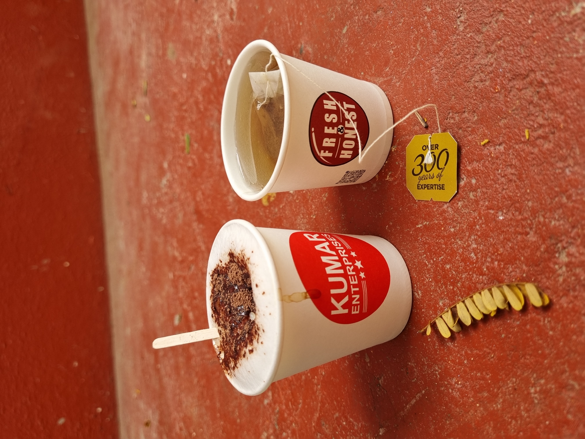 two paper cups, one containing tea and the other containing what appears to be a beverage with chocolate powder, on a red, textured surface. A yellow tag with the text "OVER 300 years of EXPERTISE" is next to the tea cup. A small, yellow leaf is next to the other cup. The text "FRESH & HONEST" is printed on the tea cup. The text "KUMAR ENTERPRISES" is printed on the other cup. The specific location within Puttaparthi, India, is not discernible from the image.