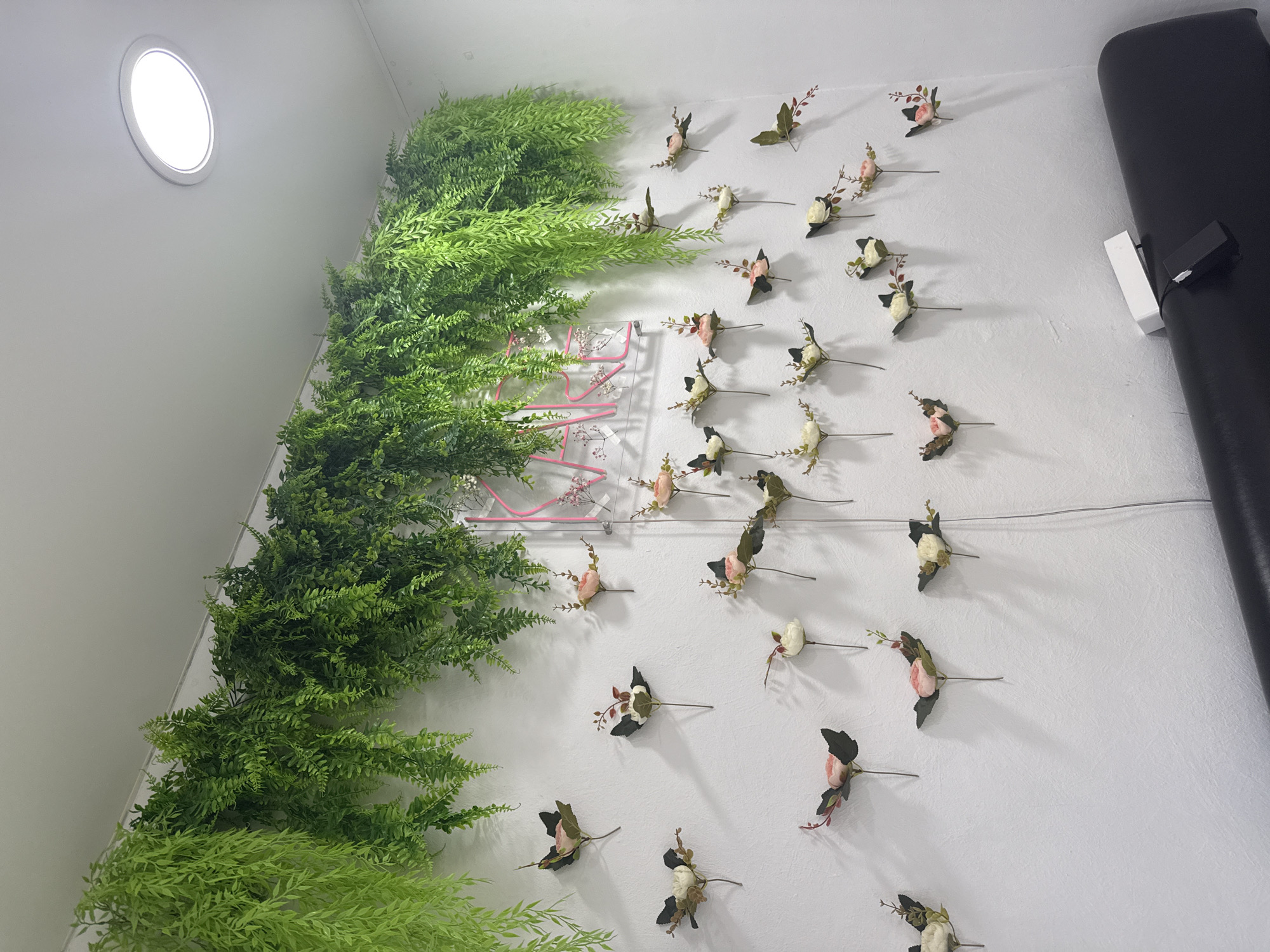 The image depicts an interior wall decorated with artificial greenery and flower arrangements