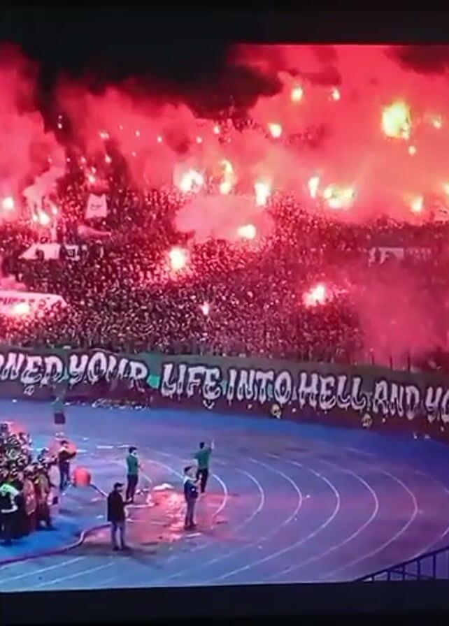 large crowd gathered in a stadium, where many fans are holding up red flares, creating a thick haze of red smoke. The crowd appears dense and packed, with people extending up into the higher tiers of the stadium. In front of the crowd, there's a track with several people standing along the edge, including individuals in green and black clothing. A large banner in front of the crowd reads "I'VE TURNED YOUR LIFE INTO HELL AND YOUR JOYS INTO FUNERALS," and another banner above it reads "YOU CAN'T HIDE." The logo of "ZEMAMA ES" is visible in the bottom right corner of the screen.