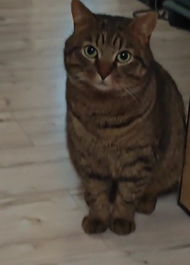 - "A brown tabby cat sits on a wood-look laminate floor next to a cabinet or door frame" by FM-P9SdV2, licensed under CC BY 4.0