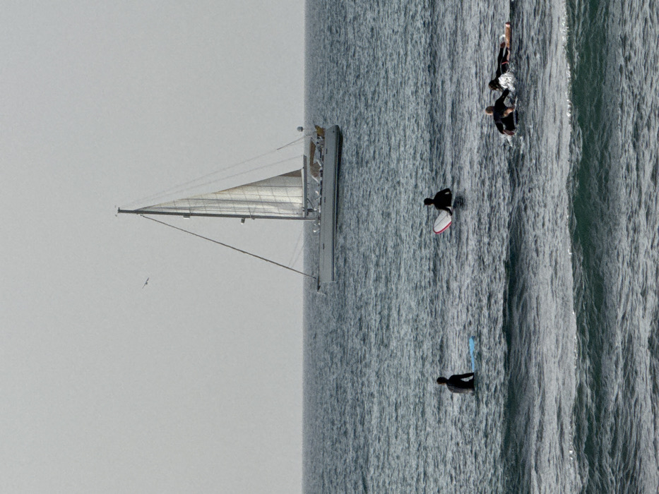 The image depicts an offshore seascape off the coast of Tel-Aviv, Israel. The upper half of the frame is dominated by a uniform light grey sky, meeting a dark blue-grey sea at the horizon line. The water surface displays moderate choppiness with visible wave formations in the foreground. In the middle ground, a white monohull sailboat with a single tall mast and a partially unfurled white mainsail is visible, sailing towards the right side of the frame. Several small white birds are perched along the port side railing of the sailboat. In the foreground, four individuals are present in the water, all wearing dark wetsuits. Two individuals are standing or sitting in the water, each accompanied by a surfboard. The individual on the left is positioned with a light blue surfboard. The individual to their right holds a white surfboard featuring pink rails. Further to the right, two other individuals are lying prone on surfboards, appearing to paddle or wait for waves.