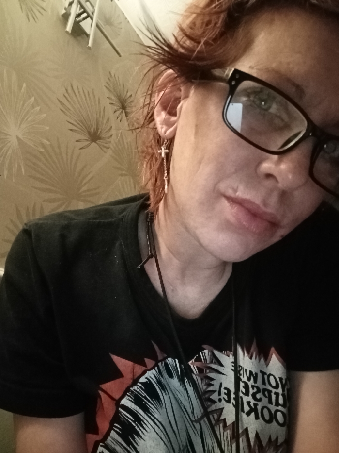 close-up of a person's face and upper torso. They have reddish-brown hair, which is partly covering their face. The person is wearing glasses and a black t-shirt with a graphic design on the front. They are wearing a silver cross earring in their left ear. The background appears to be a wall with a patterned wallpaper of a leafy design. The person is looking directly at the camera, with a neutral expression. The image was taken indoors, and the lighting is soft. The coordinates provided (52.675, -1.17) locate the image in Leicester, United Kingdom, specifically in the city centre.