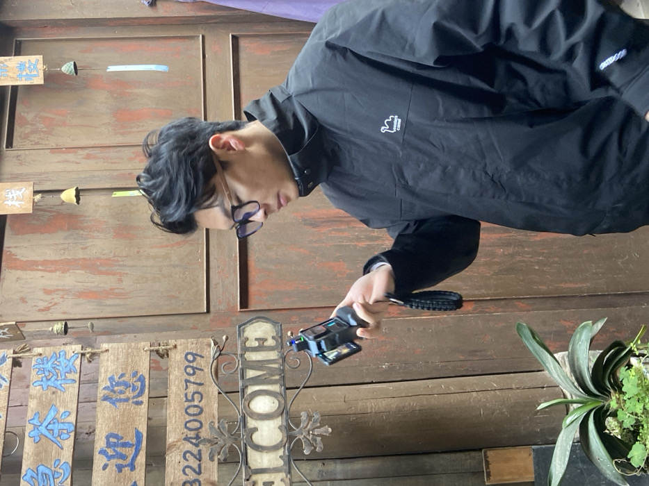 An Asian man in a black jacket and glasses holds a small electronic device, possibly a camera or sensor. He stands in front of a wooden wall with Japanese characters, a "WELCOME" sign, and wind chimes. A potted plant sits on the right. The man appears to be examining or photographing something with the device. The overall scene suggests a tourist or traveler exploring a cultural site.