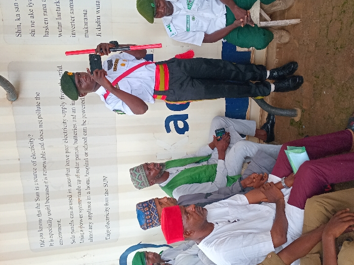 The scene depicts an outdoor gathering in Rigachikun, Nigeria, featuring five adult males against a white shipping container. In the center, a uniformed male in a green beret, white short-sleeved shirt with epaulets, a red and striped sash, dark trousers, and black shoes, stands holding a black smartphone horizontally in his left hand and a red and black baton in his right, appearing to record or present. To his left, seated on a low surface, are three men: the closest wears a white long-sleeved shirt, a red fez, and maroon trousers, holding a light blue folder in his lap; behind him, another wears a patterned blue and white cap and a white long-sleeved shirt; and further back, a man wears a dark cap, a light-colored long-sleeved shirt, and a green vest, holding a dark smartphone. To the right of the standing figure, a partially visible male in a green beret, white shirt with green trim, and green trousers is seated on a small wooden stool. The white container in the background displays English text on the left, including: "Did you know that the Sun is a source of electricity? It is especially useful because it is renewable and does not pollute the environment. Solar panels can be used in areas that have poor electricity supply from the grid. Using a power system made up of solar panels, batteries and an inverter, almost any appliance in a home, hospital or school can be powered. Enjoy electricity from the SUN!" Corresponding text in another language is visible on the right. A grey flexible conduit extends from the base of the container to the ground near the standing man's feet. The ground consists of compacted dirt.