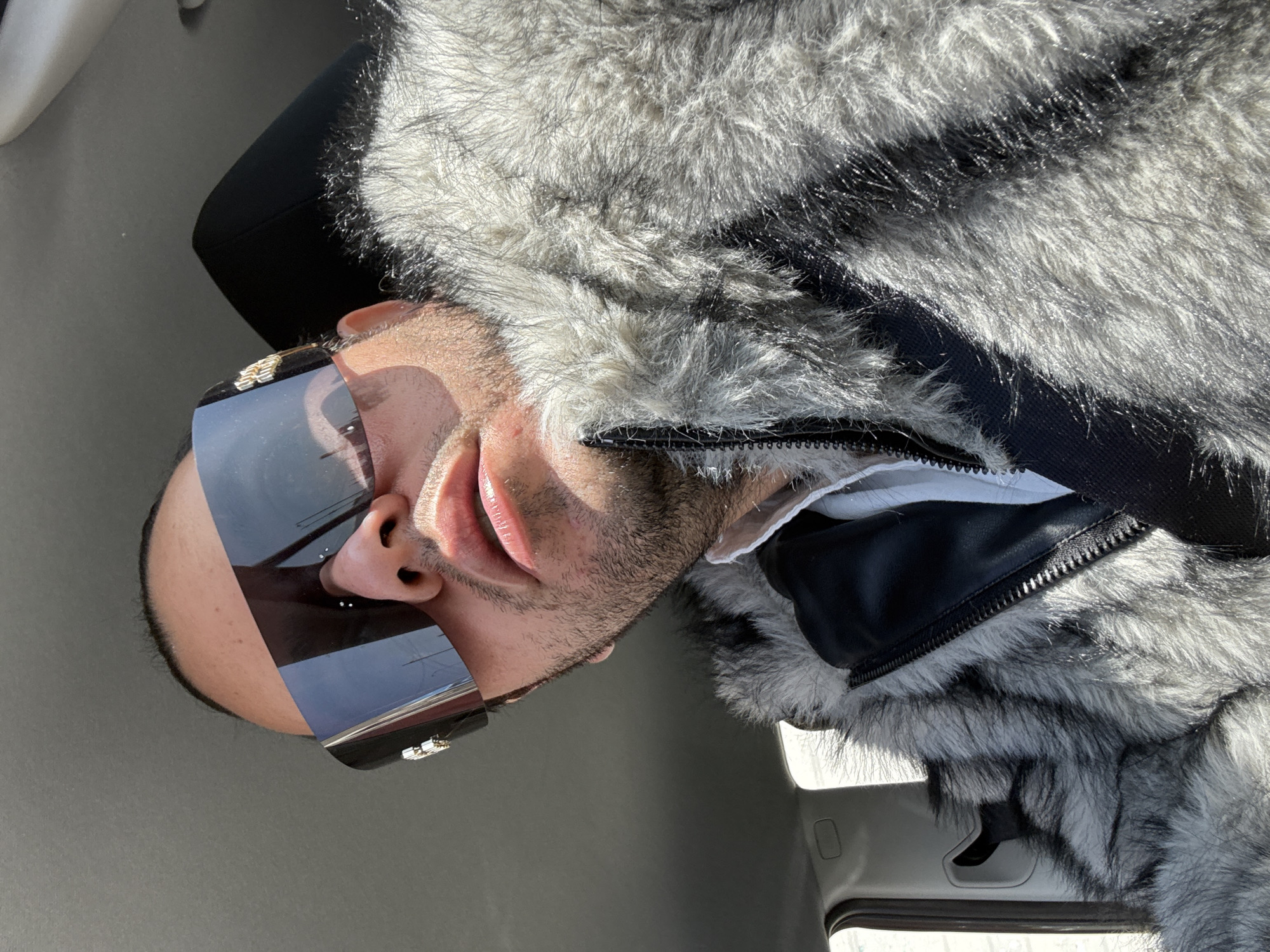 A man with dark hair and a beard, wearing large reflective sunglasses, is wearing a fur-lined jacket with a black collar and zipper