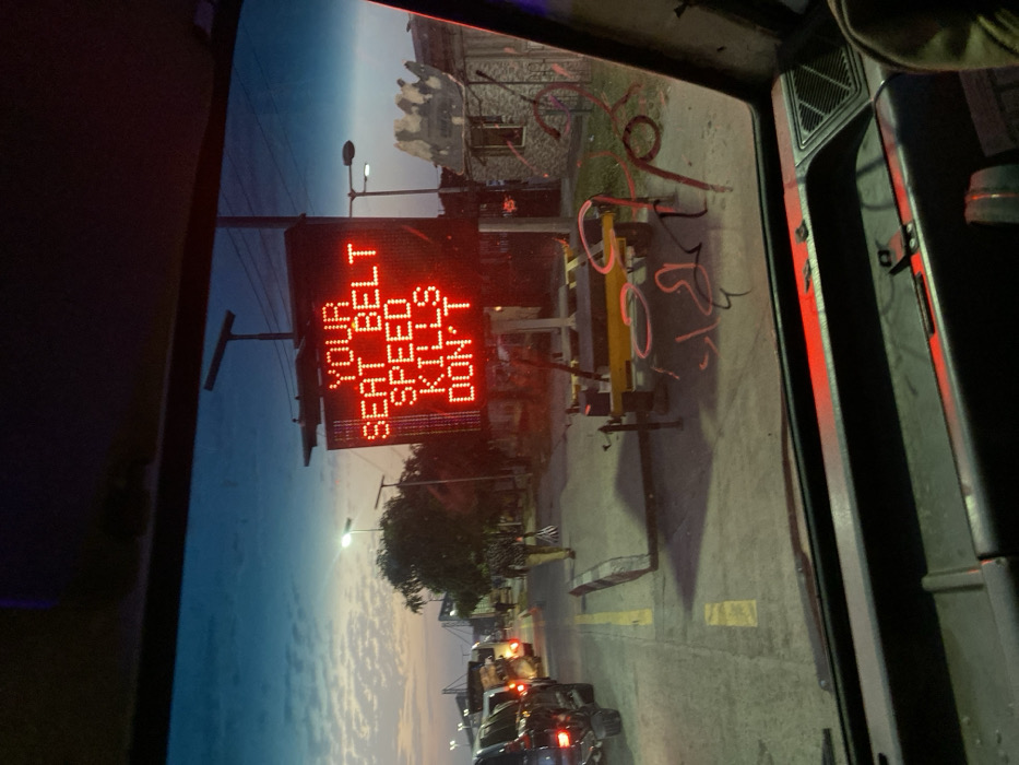The image depicts an outdoor road scene in Ikeja, Nigeria, observed from the interior of a vehicle during twilight. A prominent red LED electronic display sign, mounted on a yellow portable base with solar panels on top, is positioned on the right side of the road. The sign displays the text "YOUR SEAT BELT SPEED KILLS DON'T" in red capital letters. To the left of the sign, traffic is visible in a single lane, consisting of multiple vehicles with illuminated rear lights, suggesting slow movement or a stop. One individual, wearing a patterned shirt and dark trousers, walks away from the camera on the left side of the road, carrying a striped bag. The road surface features yellow painted lines. In the background on the right, two small, somewhat dilapidated structures are visible. Streetlights illuminate the scene. The sky exhibits a gradient from light blue to a faint orange/pink at the horizon, with cloud formations present. The foreground shows the top of a vehicle's dark dashboard and the lower portion of a windshield, which has red, squiggle-like markings.